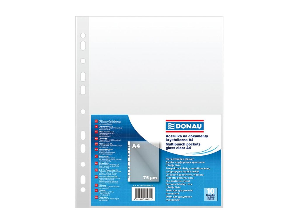 Priehľadné číre euroobaly z polypropylénu balené v sáčku. Otvor zhora, eurodierovanie, povrch lesklý a hladký. Formát A4. Hrúbka 75 mikrónov. Balenie 10 ks.