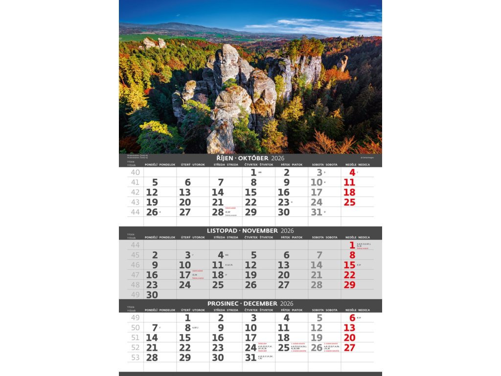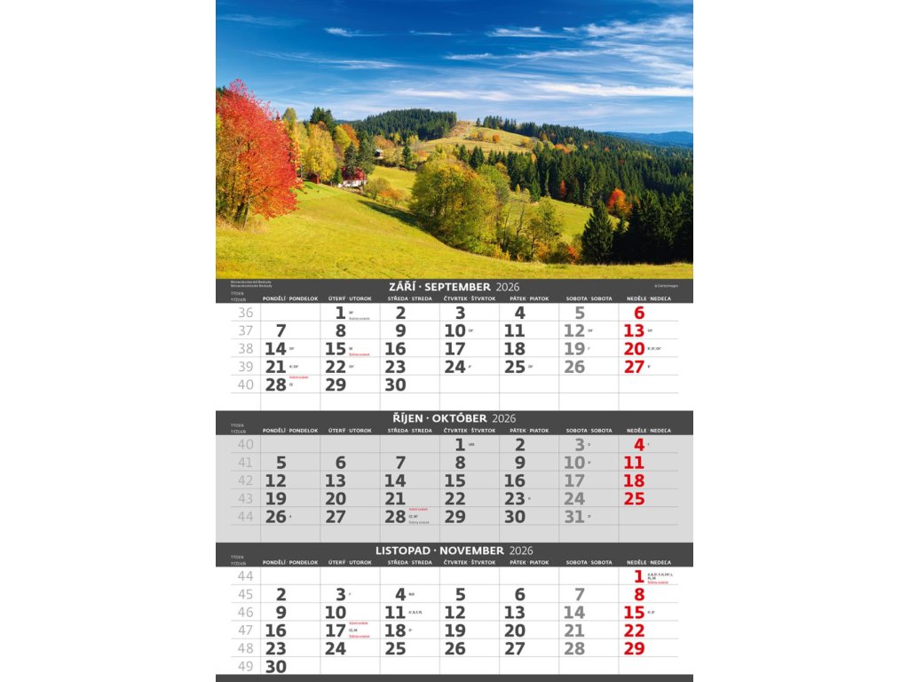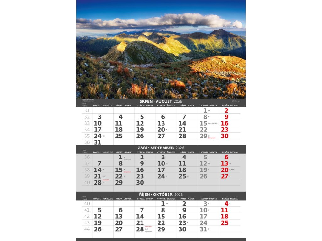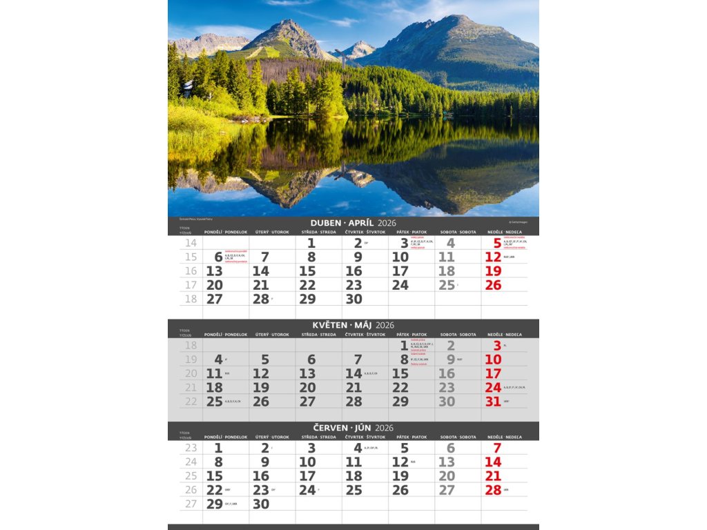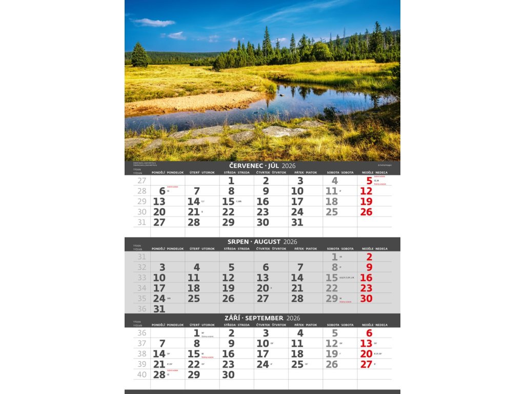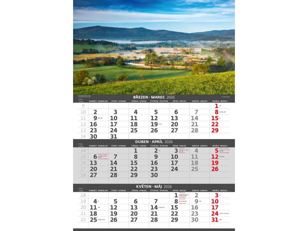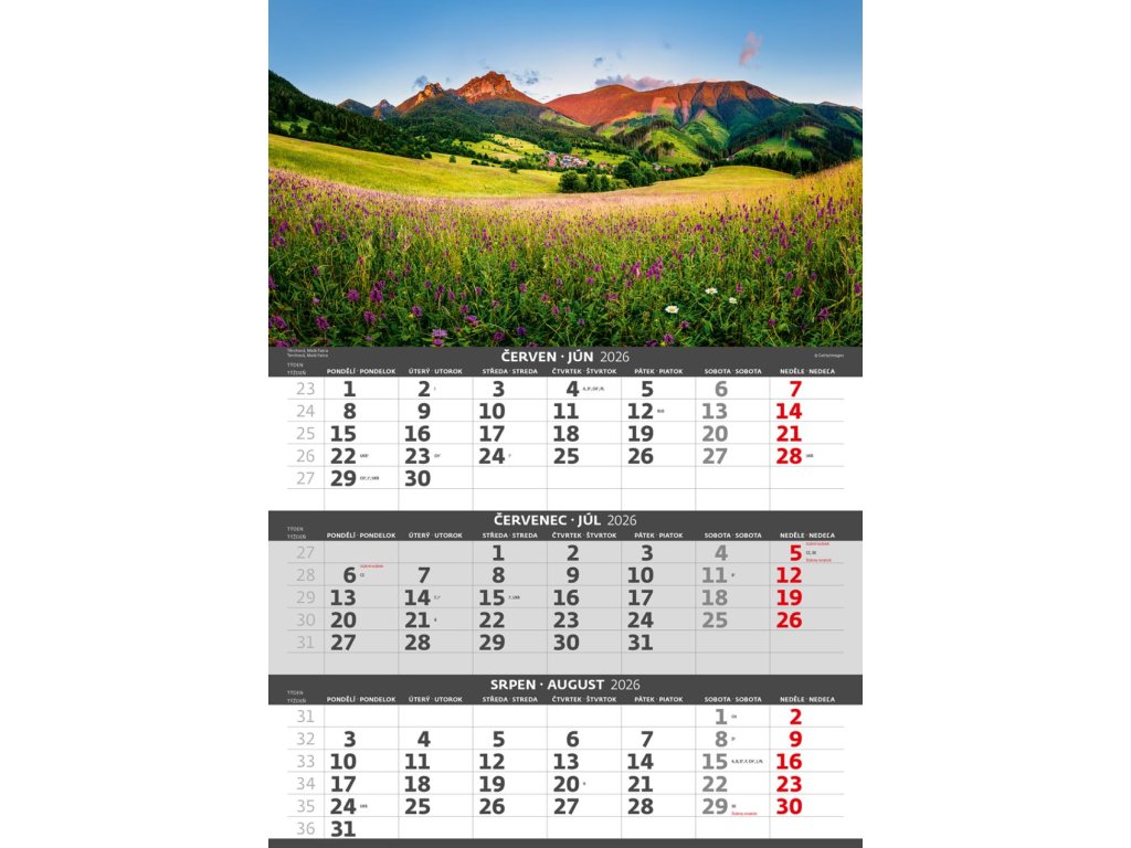 Formát kalendára: 31,5 x 45 cmKalendárium: české/slovenské trojmesačné so sviatkami európskych štátov (CZ / SK / A / B / D / F / H / CH / I / PL / RUS / UKR)