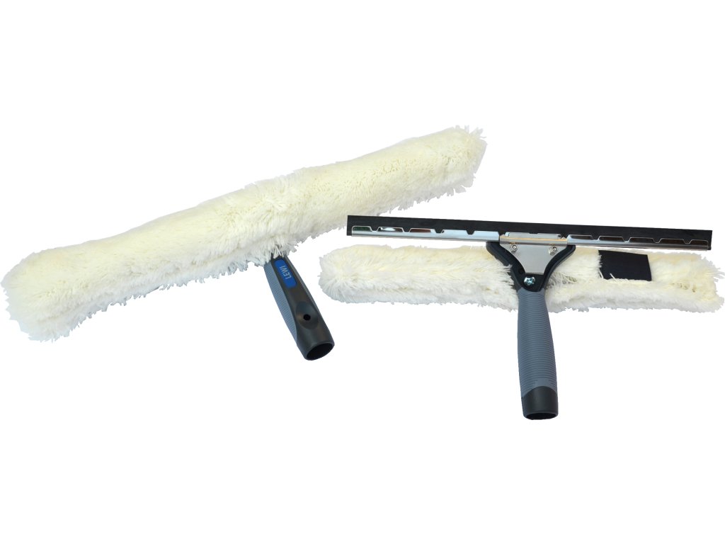 Vysokokvalitná značková nerezová stierka LEWI s plastovou rukoväťou v kombinácii s držiakom okenného mopu, vrátane mopu a vymeniteľnej gumy.